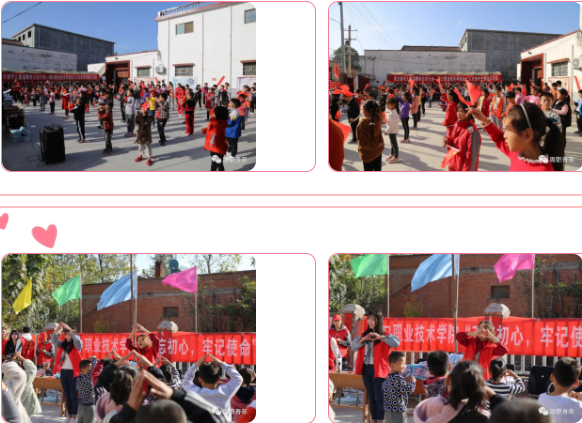 志愿者们教小学生唱红歌《红星闪闪》,小朋友挥动着小小的五星红旗,用天籁般的歌声唱出了心中的感恩之情!同时,我校志愿者还教给小学生跳舞,“你笑起来真好看,像春天的花一样”,孩子们有模有样的学习着,校园里到处洋溢着孩子们的欢声笑语,现场热闹非凡。