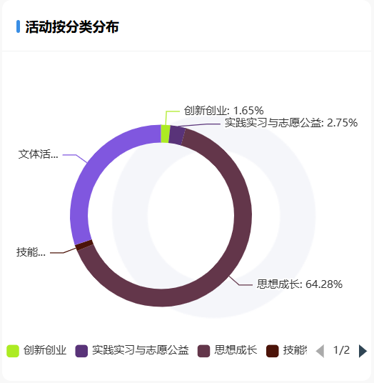 活动主要以思想成长类为首,其频率高达64.28%,其次是文体活动,实践实习与志愿公益也紧跟其后。