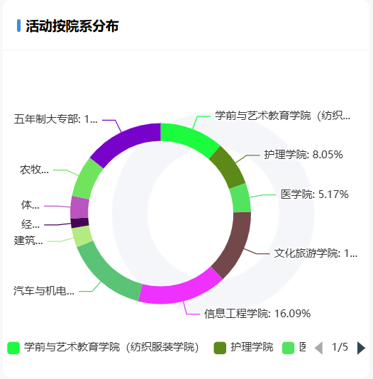 各院系发布的活动数量占比,数量较多的学院依次有信息工程学院、汽车与机电工程学院和五年制大专部。