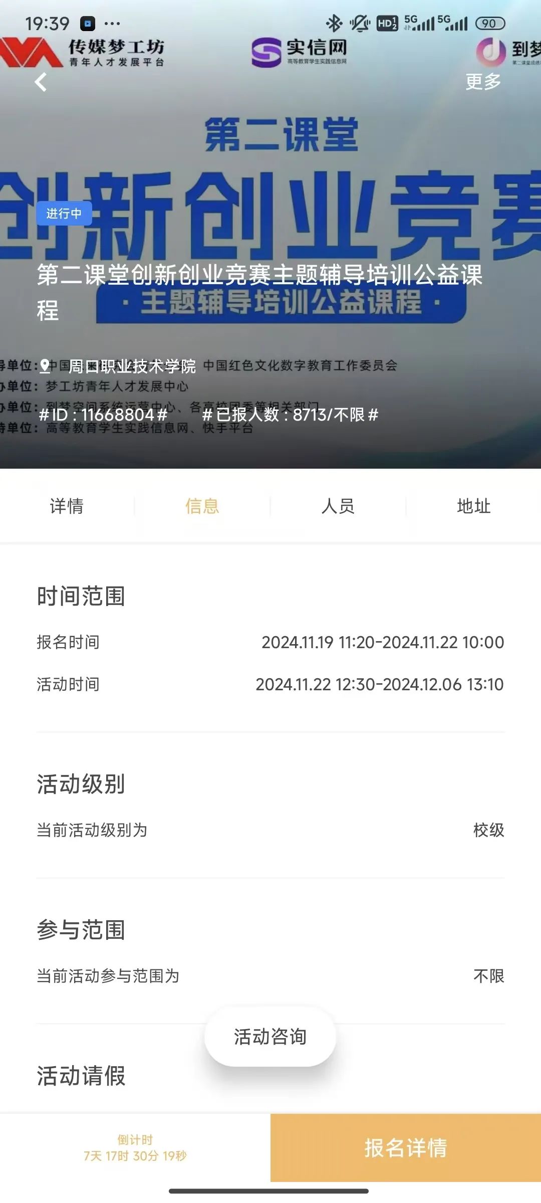 第二课堂创新创业竞赛主题辅导培训公益课程活动在本周基本完善,报名人数较多,几乎全校参与,在本校名次靠前。