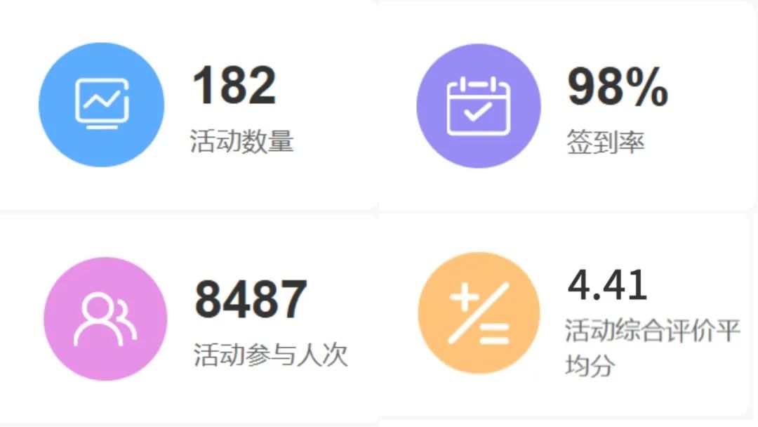 我校第二课堂本周活动量为:182,活动参与人数为8487,活动的签到率达到98%,几乎全员参与,活动综合评价的平均分为4.41。