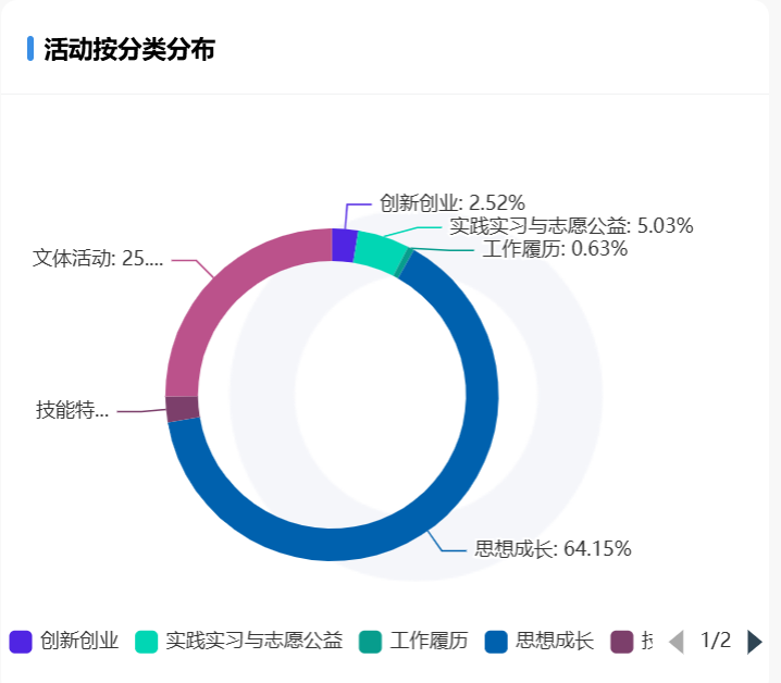 各院系发布的活动数量占比,数量较多的学院依次有五年制大专部、汽车与机电工程学院和学前与艺术教育学院。