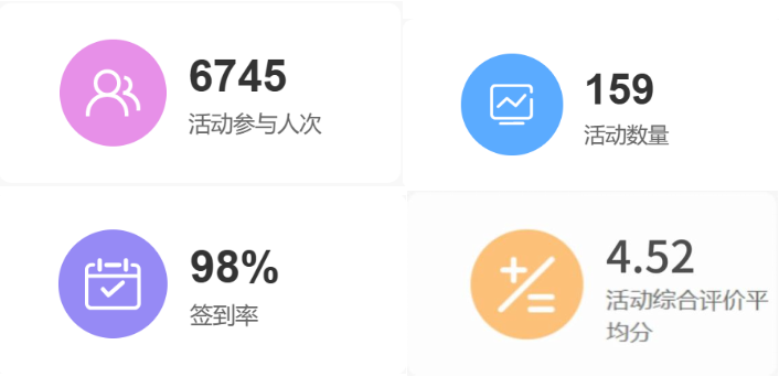 我校第二课堂本周活动量为:159,活动参与人数为6745,活动的签到率达到98%,几乎全员参与,活动综合评价的平均分为4.52。