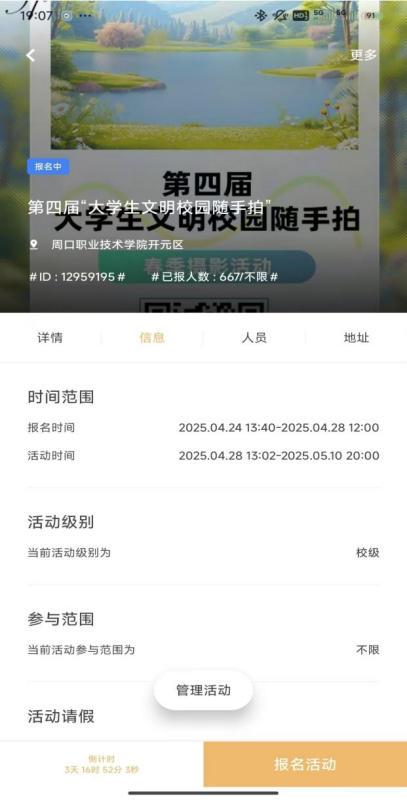 1、阳春三月,万物复苏,为深入学习贯彻落实习近平总书记关于精神文明建设的重要论述,引导广大学生以青春力量引风气之先,鼓励学生用镜头记录“春天里的文明”,第四届“大学生文明校园随手拍”春季摄影活动正式开启。该活动从校园文明行为、校园美景以及校园文化活动三方面进行,展现新风尚,传递人与自然和谐共处生态理念,展现青年学生对文化传承的责任感,进一步推动青年学子积极践行社会主义核心价值观,助力“五育并举”在校园落地生根,使文明校园建设与新时代人才培养深度融合。
