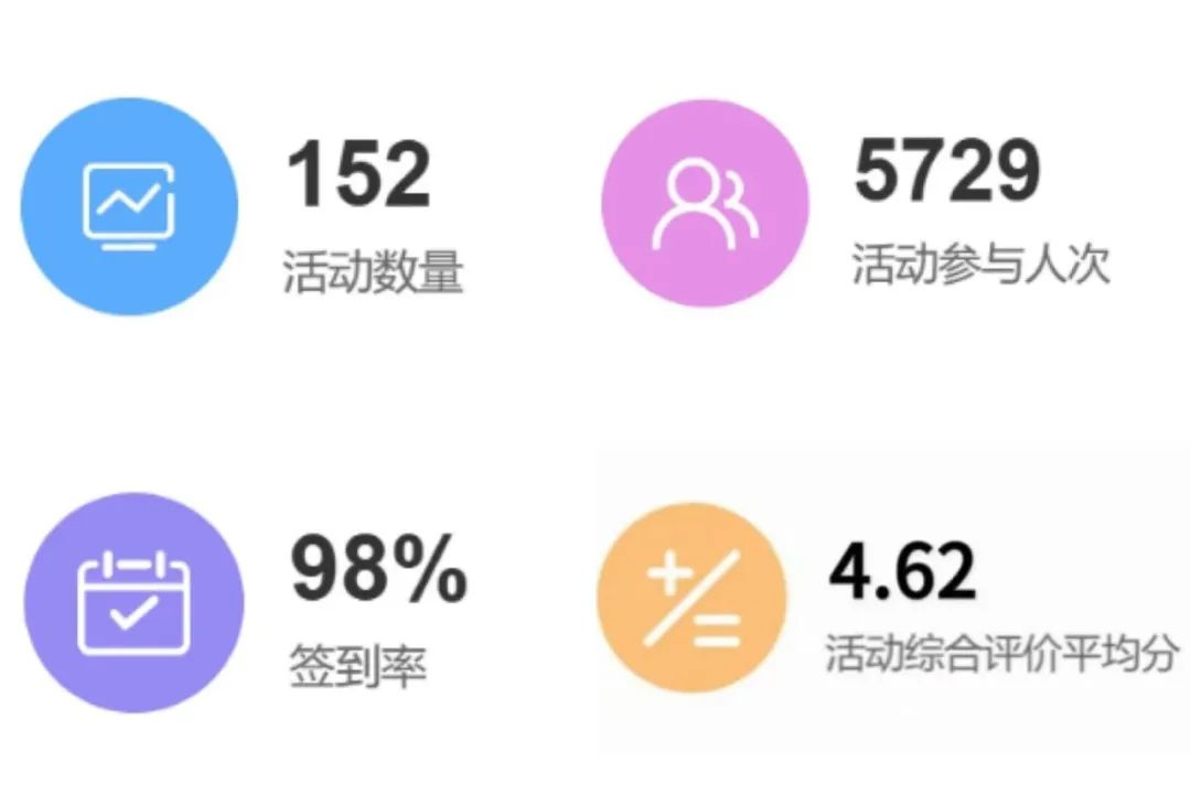 我校第二课堂本周活动量为:152,活动参与人数为5729,活动的签到率达到98%,几乎全员参与,活动综合评价的平均分为4.62。