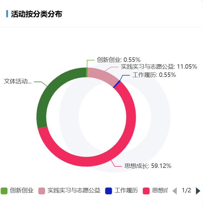 活动主要以思想成长类为首,其频率高达59.12%,其次是文体活动,实践实习与志愿公益也紧跟其后。