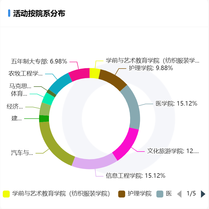 各院部发布的活动数量占比,前三名分别是汽车与机电工程学院、医学院、信息工程学院。