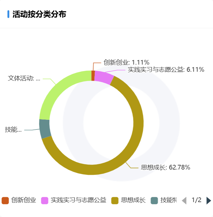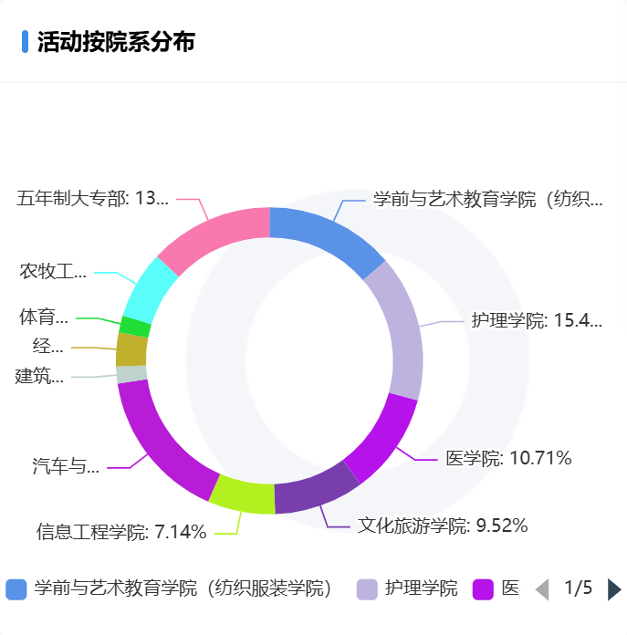 各院系发布的活动数量占比,前三名分别是汽车与机电工程学院、护理学院、学前与艺术教育学院(纺织服装学院)。