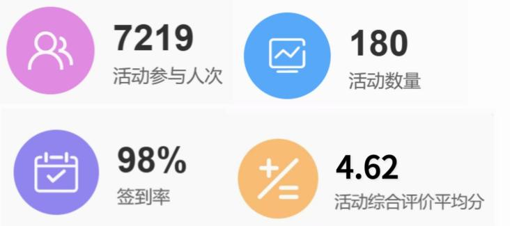 我校第二课堂本周活动量为180,活动参与人数为7219,活动的签到率达到98%,几乎全员参与,活动综合评价的平均分为4.62。