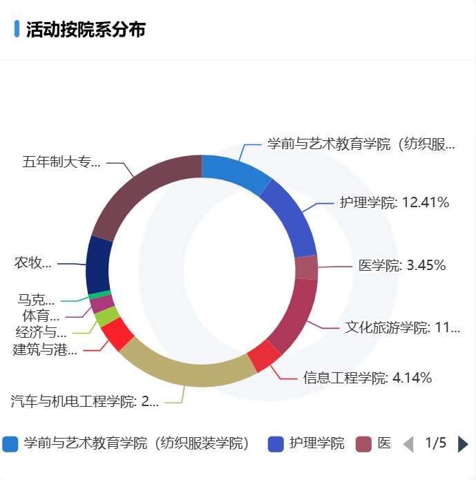 各院系发布的活动数量占比,前三名分别是汽车与机电工程学院、五年制大专部、护理学院。