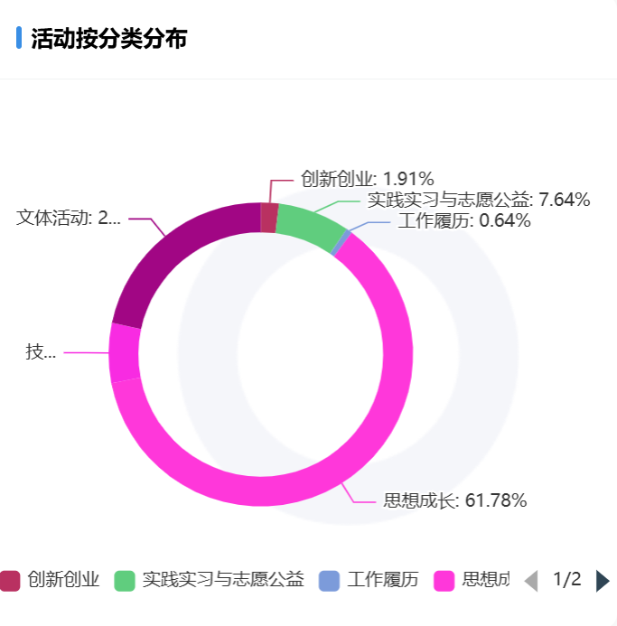活动主要以思想成长类为首,其频率高达61.78%,其次是文体活动,实践实习与志愿公益也紧跟其后。