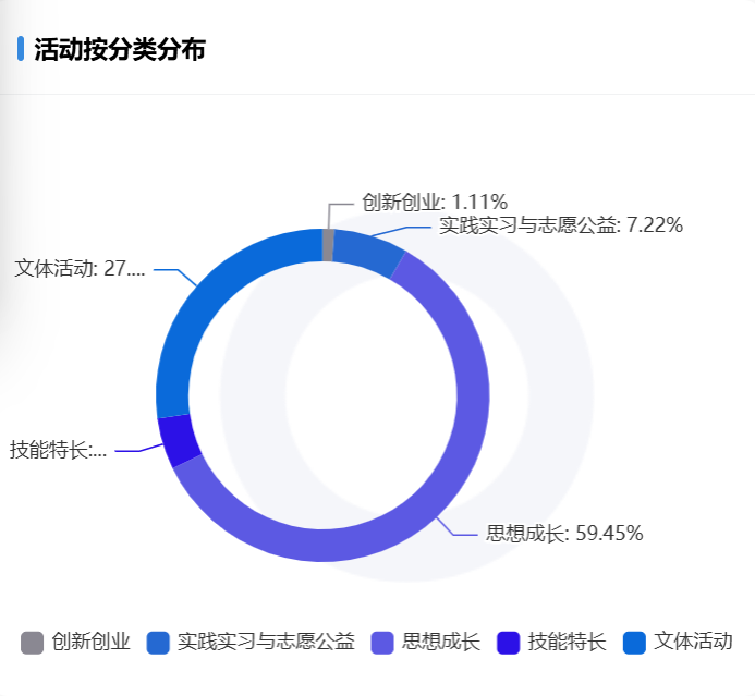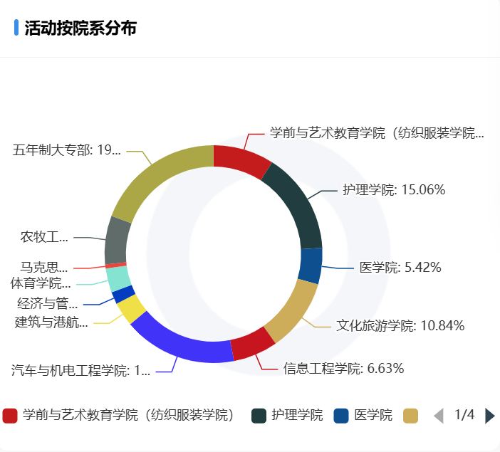 各院系发布的活动数量占比,前三名分别是五年制大专部、汽车与机电工程学院、护理学院。