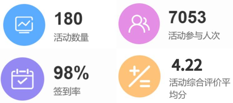 我校第二课堂本周活动量为180,活动参与人数为7053,活动的签到率达到98%,活动综合评价的平均分为4.22。