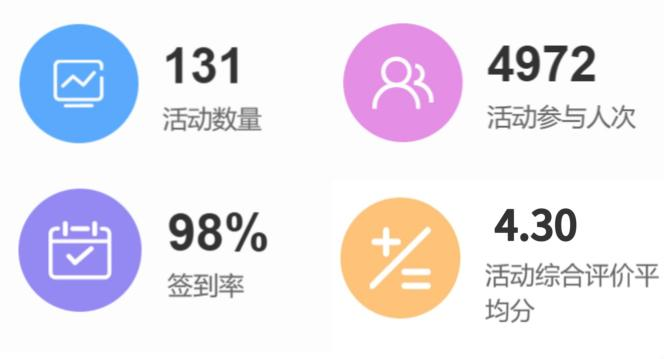 我校第二课堂本周活动量为131,活动参与人数为4972,活动的签到率达到98%,几乎全员参与,活动综合评价的平均分为4.30。