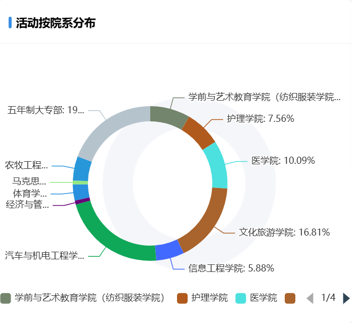 各院系发布的活动数量占比,前三名分别是汽车与机电工程学院、五年制大专部、文化旅游学院。