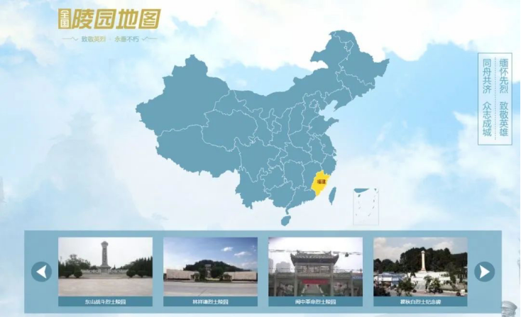 5、点击“陵园扫墓”板块,可进入各省的国家级烈士陵园,了解烈士陵园简介,为革命烈士纪念碑献花。