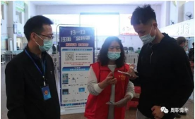 5月15日,周口市城区下起了大雨,但这丝毫阻挡不了志愿者爱心奉献的热情,在周口市长途汽车客运站候车大厅内和乘客出站处,身着红马甲的我校志愿者正在引导乘客扫码注册“金钟罩”防电诈小程序,并向他们宣传防电诈知识,从而引来乘客在宣传展架前驻足咨询。