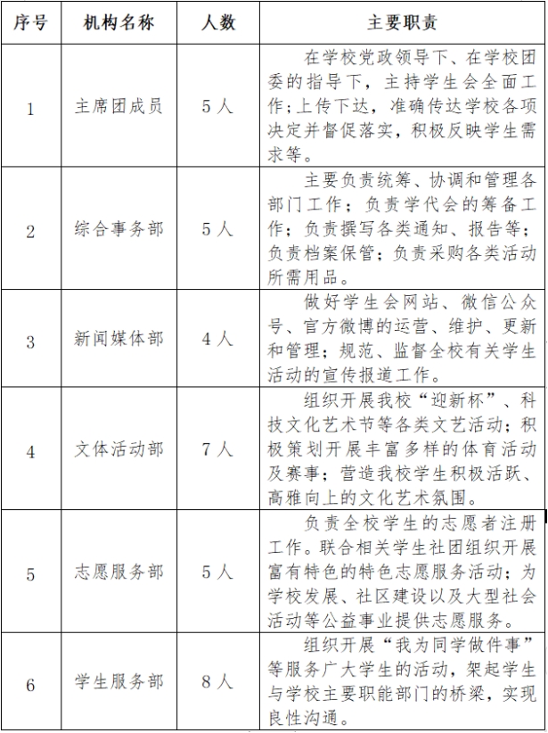 (四)院(部)学生会组织机构参照校学生会组织机构模式适当设置。工作人员一般为20-30人,除主席团成员和工作部门成员,均不设置其它任何职务。