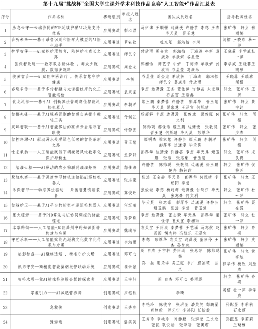 根据第十九届“挑战杯”全国大学生课外学术科技作品竞赛“人工智能+”专项赛相关要求,我校团委组织开展第十九届“挑战杯”全国大学生课外学术科技作品竞赛“人工智能+”专项赛工作。经个人申报、学校团委审核等环节,现将拟推荐第十九届“挑战杯”全国大学生课外学术科技作品竞赛“人工智能+”专项赛的项目作品名单予以公示,具体名单如下: