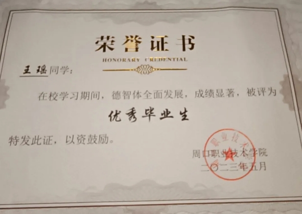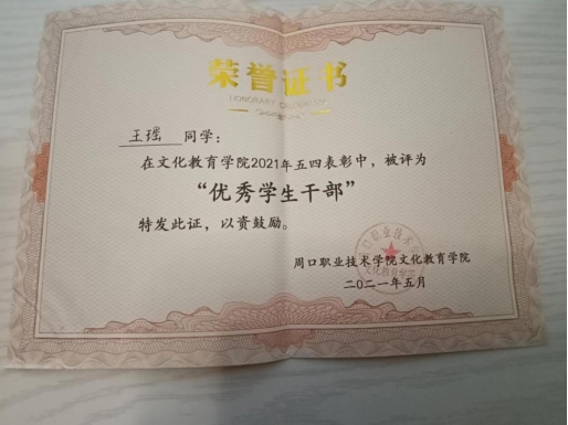 班级上,任劳任怨,工作努力。该生热情洋溢为集体服务,是老师的得力助手,是老师与同学们之间的桥梁。积极主动组织同学们参加学校组织的各项活动。被评为院级“优秀学生干部”。在2021年五四表彰中,被评为“优秀学生干部”
