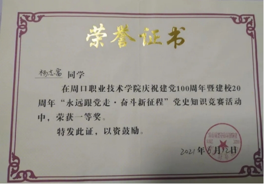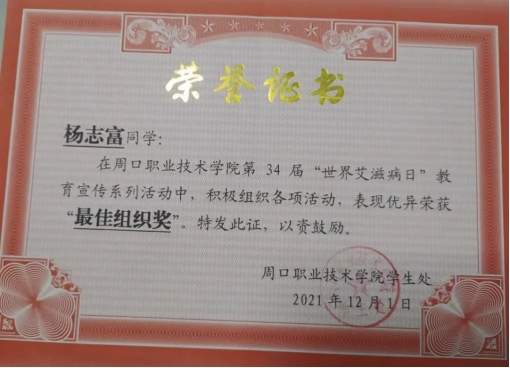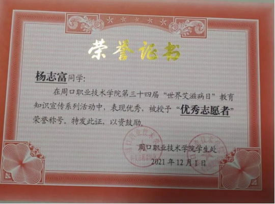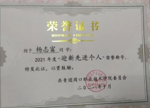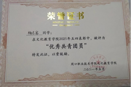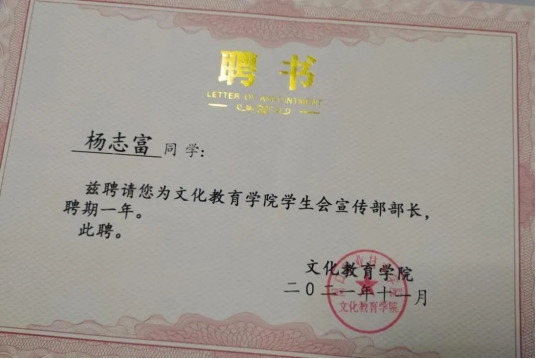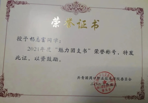 杨志富,男,yl23411永利(集团)有限公司官网,文化教育学院,20级语文教育专业7班团支书兼副班长,院团总支宣传部部长,在校期间荣获“文化教育学院优秀团员”“2021年度魅力团支书”,“文明学生”“三好学生”“yl23411永利(集团)有限公司官网20级优秀毕业生”“优秀学生干部”“国家励志奖学金”。大一时加入团总支,大二时担任宣传部部长,对党、团组织有了更深刻的认识与感悟,对团务工作也有了更加深刻的了解与认识。2021年中国共产党建党百年之际配合团总支、部长完成了征文写作比赛,并在学院和老师的指导下,参加了“中国共产党建党百年党史知识竞赛”荣获校级一等奖;在2021年yl23411永利(集团)有限公司官网第五届学生职业技能大赛师范生教学技能比赛中荣获二等奖;在yl23411永利(集团)有限公司官网第34届“世界艾滋病日”教育宣传系列活动中,积极组织各项活动,表现优异荣获最佳组织奖”,“优秀志愿者”。在2022年迎新活动中,积极奉献,积极参与,荣获“迎新先进个人”称号。2023年,考入商丘学院。
