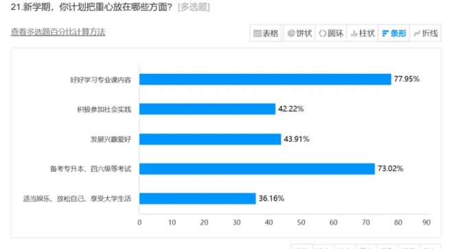 通过本次调查问卷发现部分学生还未及时调整状态进入新学期,希望同学们能尽快调整好状态以崭新的姿态,开启新学期,针对新学期的计划,同学们纷纷表示从自己规划好的学习计划开始,提高自己学习成绩、提升自身能力与素养、考取四六级证书、积极参加社团活动与社会实践、发展兴趣爱好,实现自我价值并不断完善自己的计划,为自己的未来而努力奋斗。