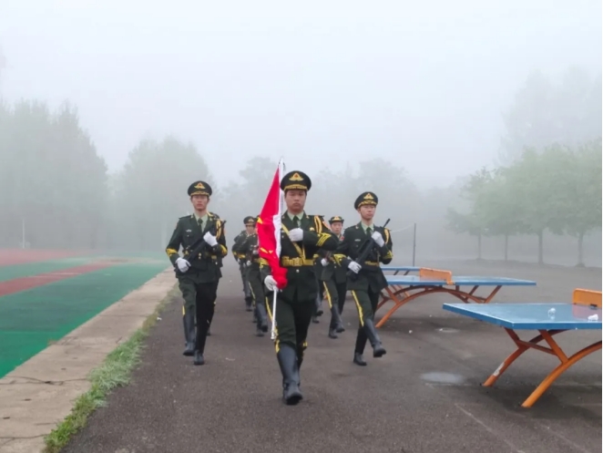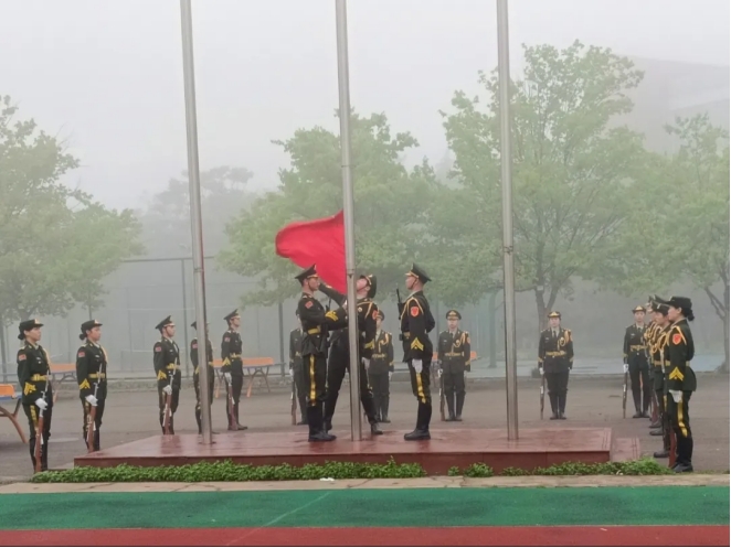 在全体师生的注目下,国旗护卫队队员身着礼宾服,目光坚毅,昂首挺胸,精神抖擞地迈着整齐有力的步伐,护送着五星红旗走上国旗台。伴随着激昂雄壮的国歌响起,五星红旗冉冉升起、迎风飘扬,全体师生目光坚定,面向国旗行注目礼。