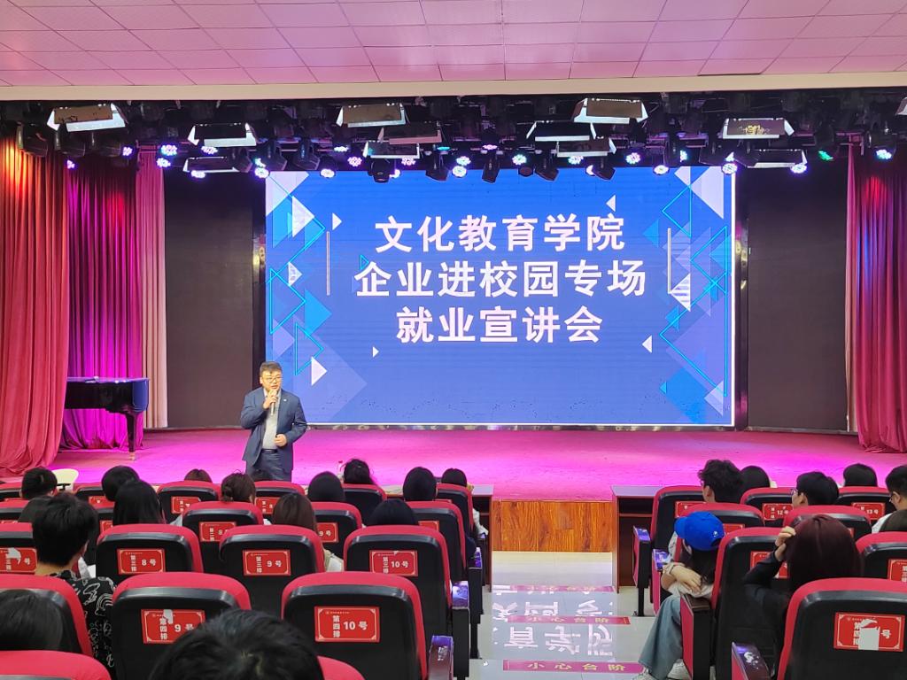 为进一步落实我院2024届毕业生就业工作的决策部署,拓宽毕业生就业渠道和资源,促进2024届毕业生高质量充分就业,5月16日我院在学前艺术演播厅举办企业进校园专场就业宣讲会。文化教育学院副院长于慧娟、就业指导员李敬敏出席此次宣讲会。
