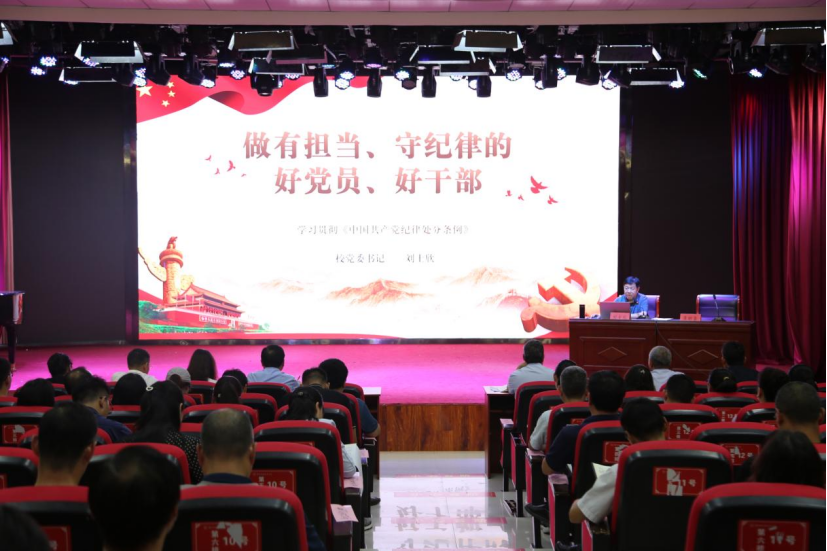 为深入学习贯彻习近平总书记关于加强党的纪律建设的重要论述,切实推动党纪学习教育走深走实,教育引导党员干部和教师学纪知纪明纪守纪,6月28日,校党委书记刘士欣教授讲授党纪学习教育专题党课。文化旅游学院全体党员参加学习,校党委副书记李明臣主持。