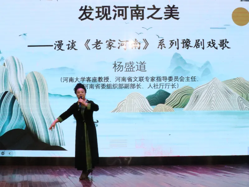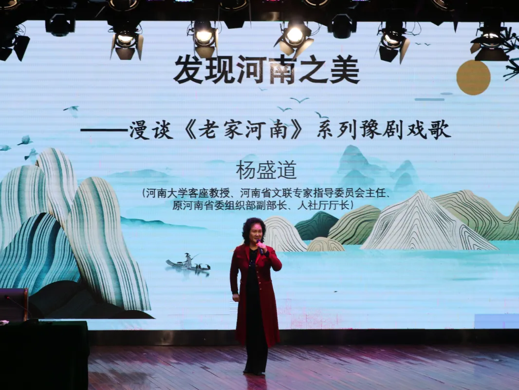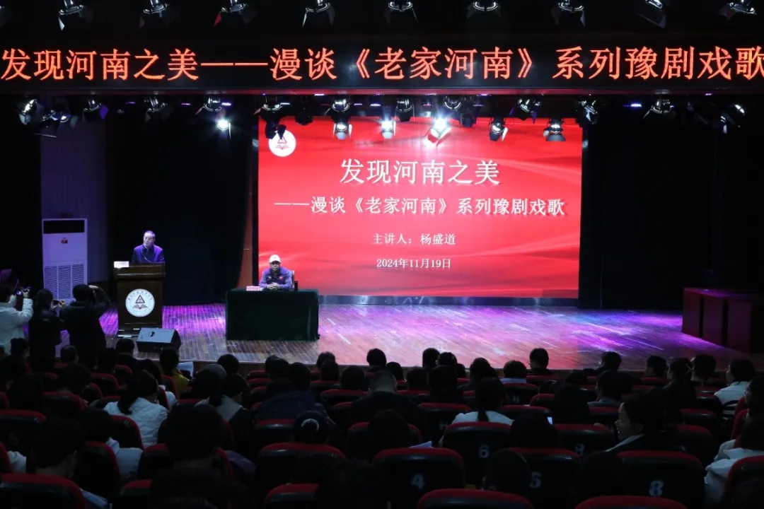 为了弘扬祖国优秀的传统文化,推进河南豫剧艺术的传承与发扬,加强同学们对豫剧的了解,以此更好地提升个人素养,坚定文化自信,凝聚民族共识 ,11月19日下午,yl23411永利(集团)有限公司官网邀请河南大学客座教授、河南省文联专家指导委员会主任、原河南省委组织部副部长、人社厅厅长杨盛道教授在砺德厅开展“发现河南之美”——漫谈《老家河南》系列豫剧戏歌的讲座。讲座由校党委副书记,工会主席郭汝礼主持。文化旅游学院党总支书记展贤东、院长史丽珍以及部分教师和学生代表参加本次讲座。