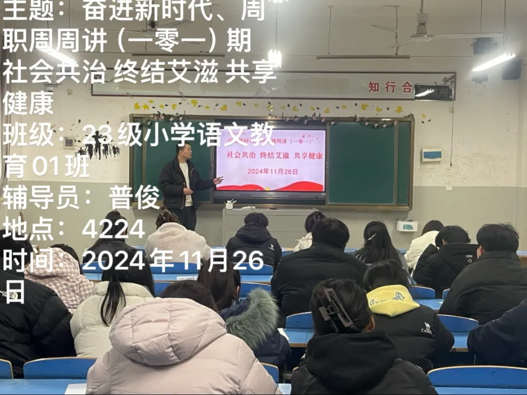 班会上,辅导员首先向同学们讲述了尊重、理解和关爱艾滋病人的重要性。随后,辅导员通过演示PPT、播放视频等方式,用通俗易懂的语言和生动的案例引导大家科学认识艾滋病,了解艾滋病病理知识、传播途径与预防措施,以及艾滋病检测方法与国家相关政策,让同学们深入了解艾滋病相关内容。