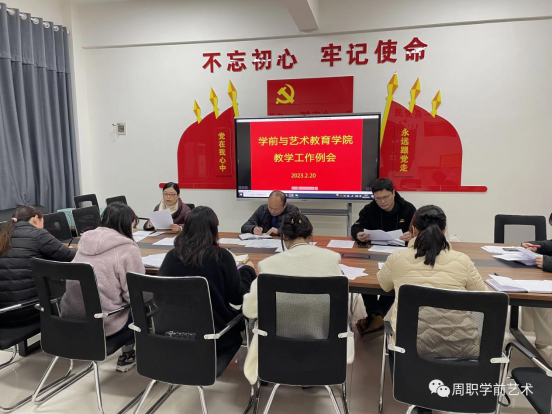 2023年2月20日下午,学前与艺术教育学院召开教学工作例会,院长高岐奎、副院长耿润、办公室主任杨晨及各教研室主任参加会议。