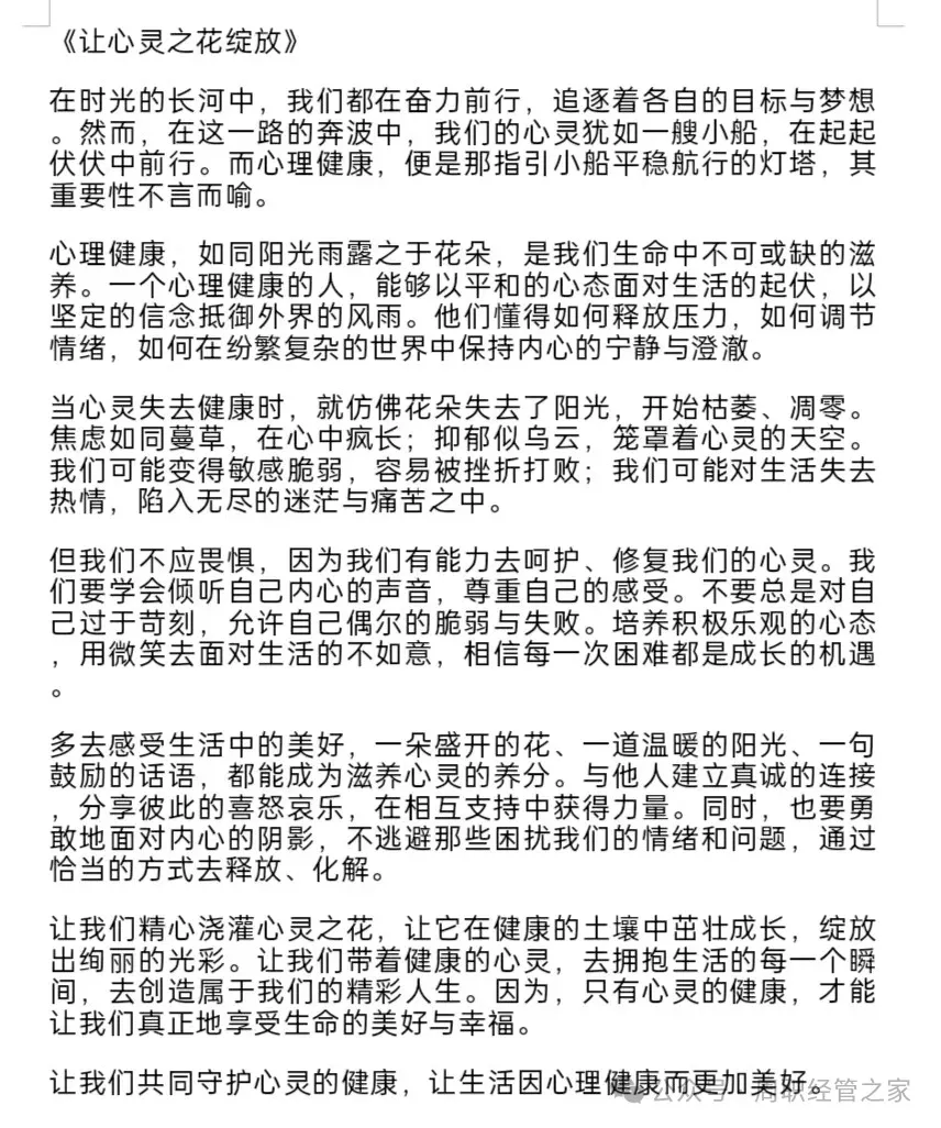 为引导大学生更加清晰地认识自我,减轻心理压力,增强自我调节能力,树立积极的人生态度,经济与管理学院举办“沐浴阳光 青春绽放”心理健康征文活动。