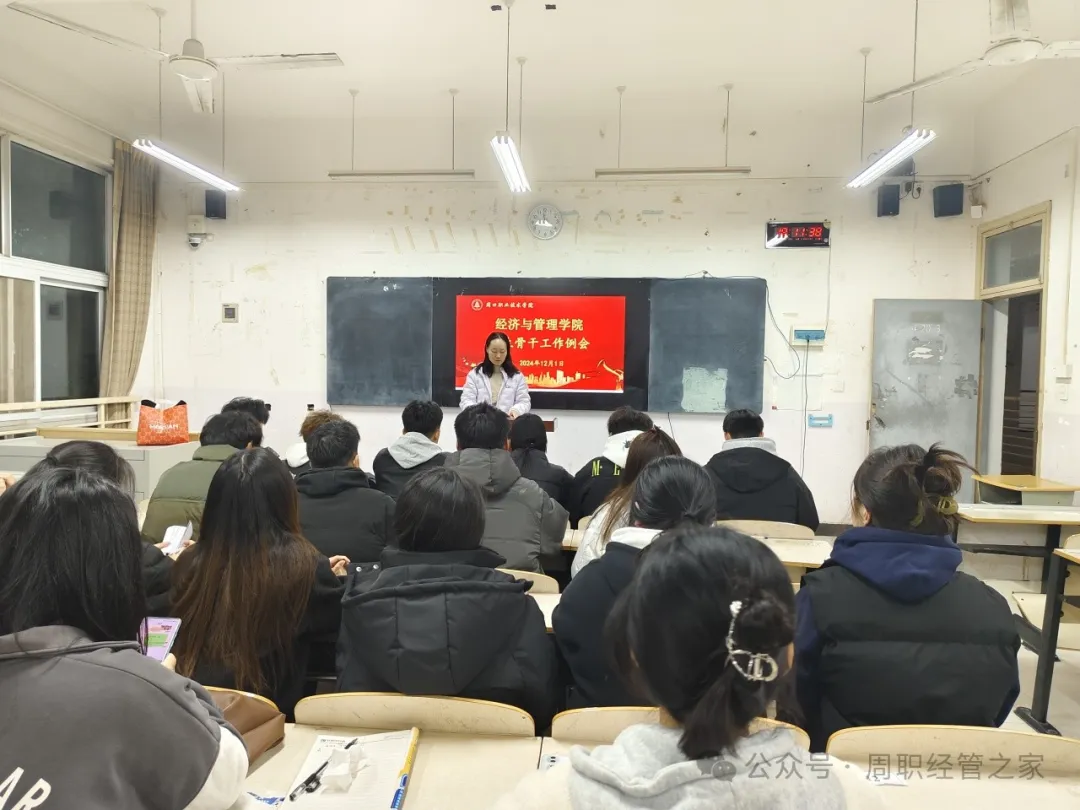 本学期的教学工作已经接近尾声,为期末各项工作的顺利收官和未来更好地开展,经济与管理学院于12月1日在4203教室召开了学生骨干工作例会。会议由学管办主任杨璐璐老师主持,23级全体学生骨干参加。