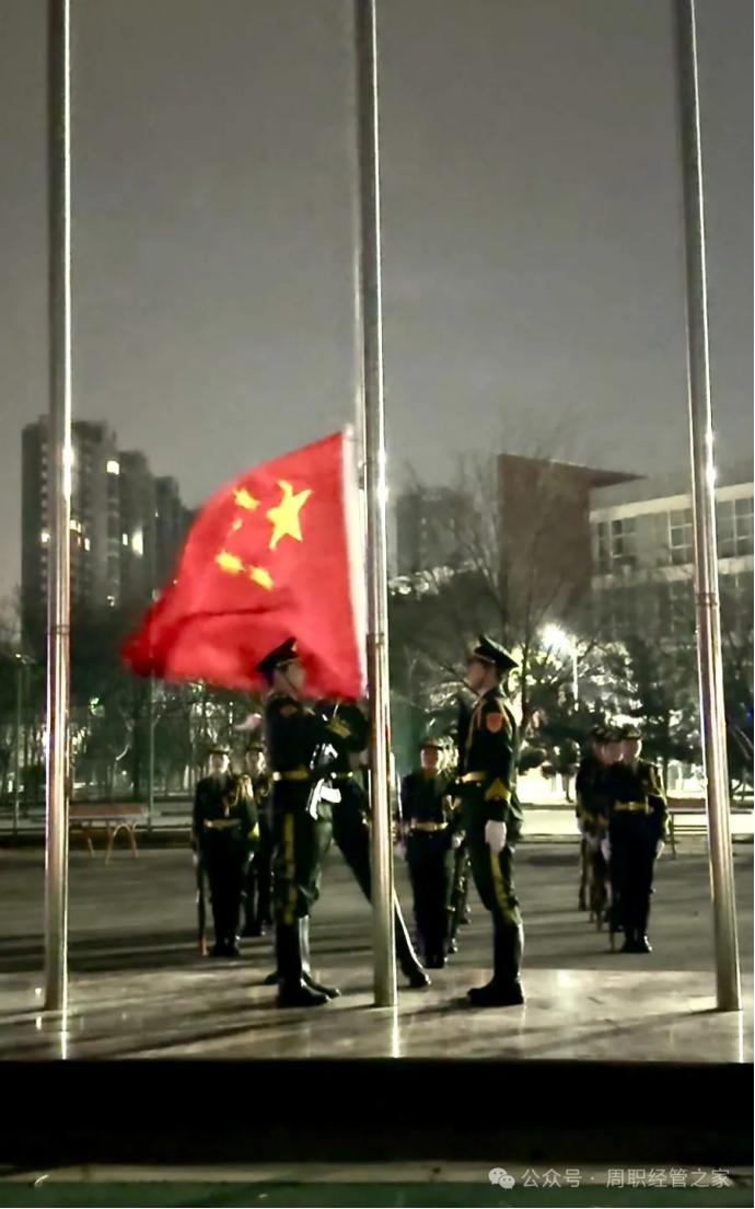 国旗护卫队迈着整齐有力的步伐护送国旗至升旗台下,伴随着庄严的国歌,国旗缓缓升起,全体师生行注目礼并高唱国歌。正值年末与新年的交汇点,学生代表苗云龙进行演讲,对本学期的各方面进行了总结,呼吁当代大学生将个人理想融入国家发展,于学业、品德、实践等方面积极努力,以青春奉献祖国。党总支书记陈鹏着重指出,专业知识与自身实践相互融合具有极为关键的意义。并在讲话中对新一年度的工作目标展开了积极展望,表达了对各项工作顺利推进、取得卓越成效的殷切期许。同时,也向同学们送上了充满温情与期待的美好祝愿,激励同学们在未来奋勇拼搏、砥砺前行。