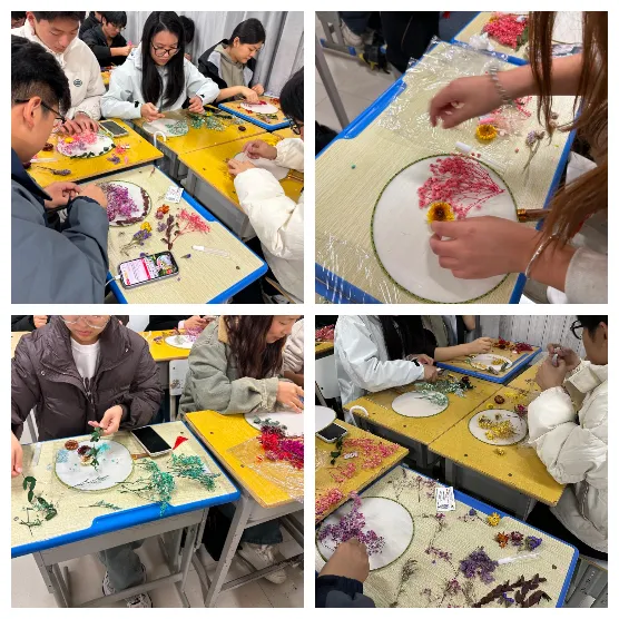 巧手翻飞,彩花堆叠,同学们仿佛置身于艺术的花园。每一朵花的精心挑选,每一片叶的仔细搭配,都倾注着对美的追求和对生活的热爱。每一把团扇都像是一扇通往独特世界的奇幻之门,承载着他们天马行空的想象和无限的创造