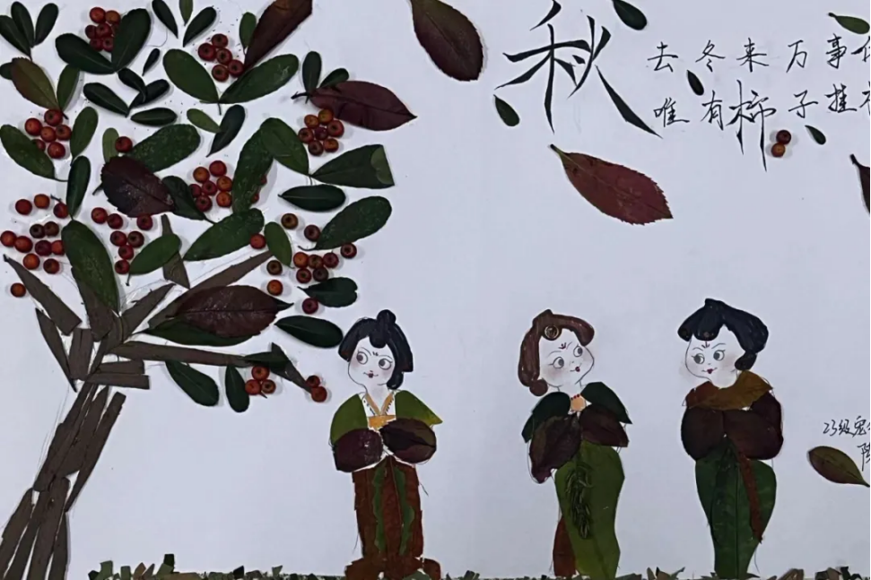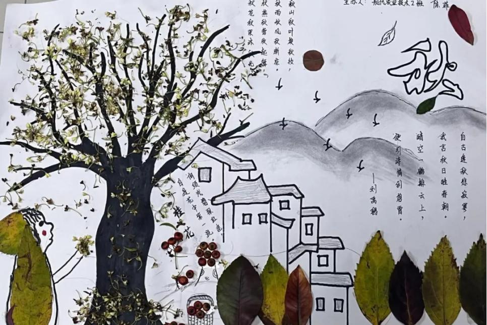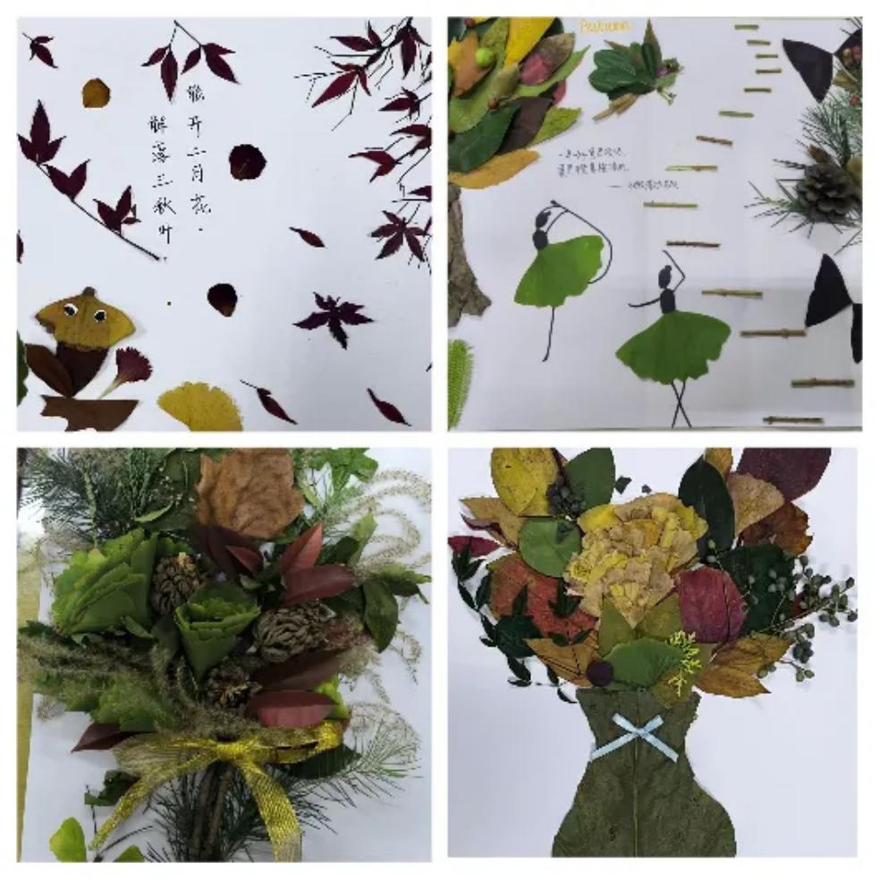 活动中,经过同学们的设计、拼接、黏贴,一幅幅设计精美、充满创意、内涵丰富的落叶画作品呈现眼前,学生亲手触摸到了秋天的韵味、领悟到了秋意之美,将这份秋意定格在纸上。