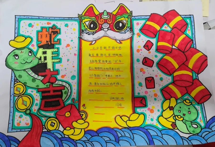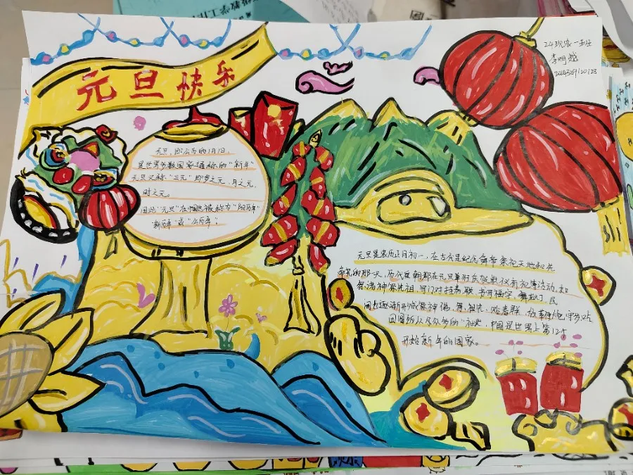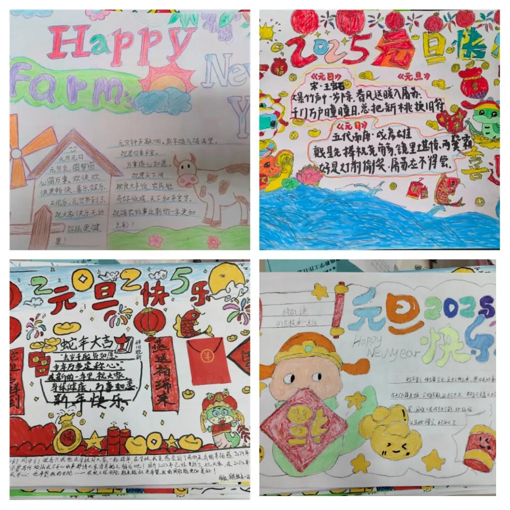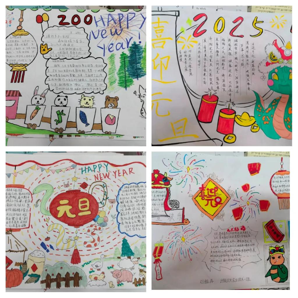 同学们充分施展自己的绘画才能,用丰富的想象力和创造力,描绘出了对新年的美好愿景。这些作品富有创意,图文并茂,文字工整,插图悦目,不仅展现了同学们的艺术天赋,也表达了他们对生活的热爱和对未来的憧憬。