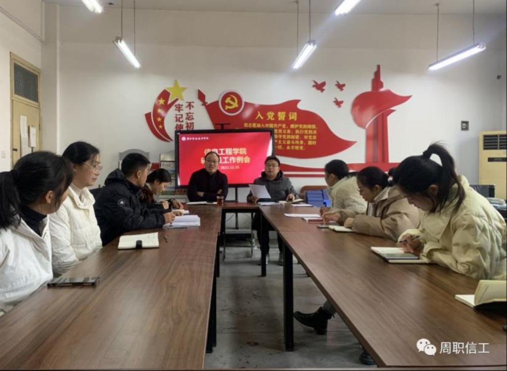 12月25日中午,在学院办公室6140,信息工程学院召开辅导员工作例会。副院长楚书来,学管办主任张矿伟及22、23级全体辅导员参加了本次会议,会议由楚书来主持。