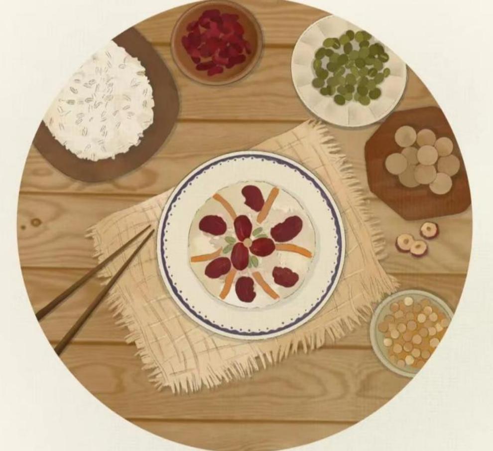 民间有大寒节气吃糯米的说法,因为糯米能够补养人体正气,吃了后会周身发热,起到御寒、养胃、滋补的作用。而糯米制作的食品,最典型的就是八宝饭。糯米蒸熟,拌以糖、猪油、桂花,倒入装有红枣、薏米、莲子、桂圆肉等果料的器具内,蒸熟后再浇上糖卤汁即成。味道甜美,是节日和待客佳品。关于八宝饭的由来各有说法,一说是周王伐纣后的庆功美食,所谓“八宝”指的是辅佐周王的八位贤士。不过更加靠谱的解释是八宝饭源自于江浙一带,经由江南师傅进京做御厨才传到北方。如今宁波、嵊州、嘉兴也都保留着过年吃八宝饭的习俗。