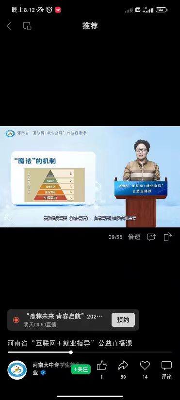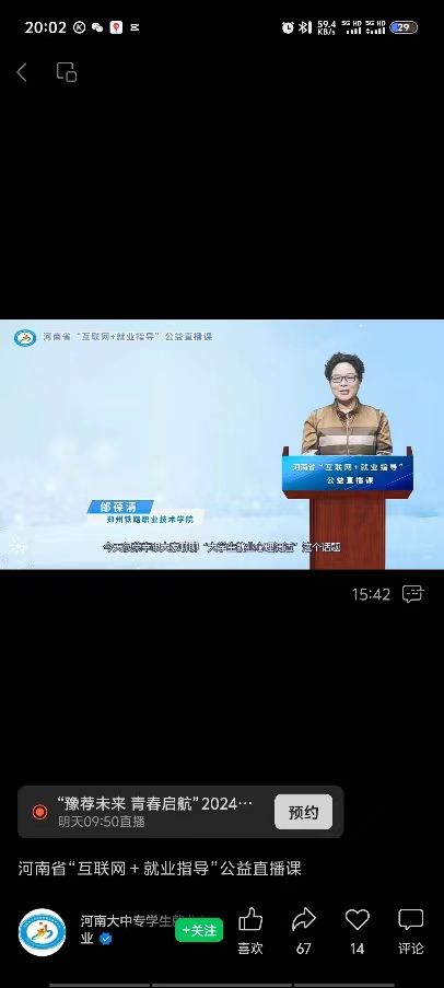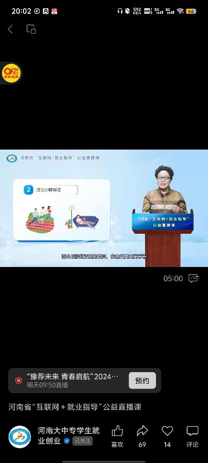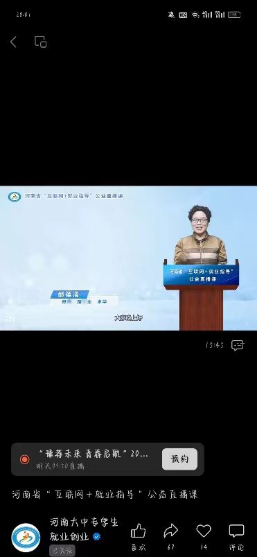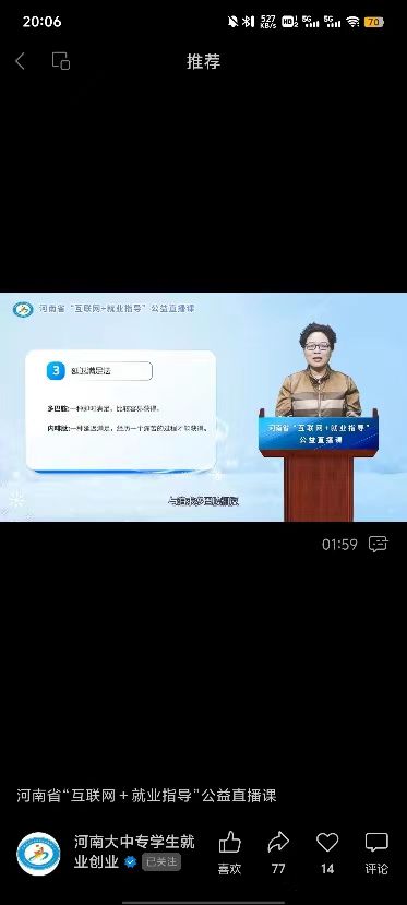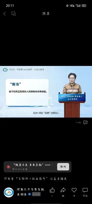 为引导大学生调整就业心态,树立积极的择业就业观,随着高校扩招,就业竞争日益激烈,大学生就业成为社会关注的热点问题。为了帮助大学生以正确的人生观、价值观、道德观和行为规范参与求职择业活动,增强社会适应能力,同时,帮助大学生树立正确的择业目标,掌握正确的求职技巧,解决求职过程中出现的问题,以及如何正确面对就业问题,“凝心聚力助就业,不负韶华早扬帆”用魔法打败魔法大学生就业心理调适,信息工程学院组织全体在校学生于6月11晚上19:00观看河南省“互联网+就业指导”公益直播课。