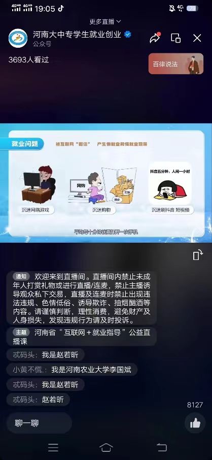 在直播开始时,郑州铁路职业技术学院的邰葆清老师,讲述了同学们沉溺于网络世界,在就业中没有明确的职业价值观,甚至可能会出现懒就业和慢就业心理,核心问题是他们不愿意面对激烈竞争的现实世界,告诉他们如何更好的解决这些问题,最后,邰葆清老师鼓励大家减少焦虑与迷茫,为顺利毕业和未来发展创造良好的心理环境。