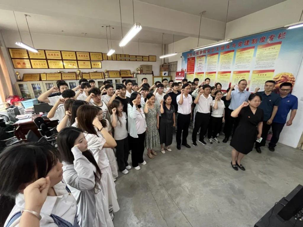 完成接收议程之后,由党总支宣传委员侯艳芳领誓,新接收的学生预备党员面向党旗,庄严宣誓,全体党员面向党旗,重温了入党誓词。