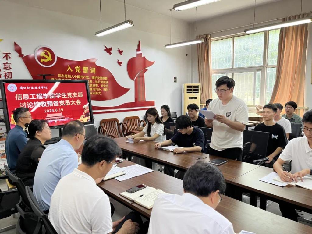 根据党员发展工作计划,并经上级党组织预审同意,2024年6月19日下午,在学院党员活动室6140,信息工程学院召开党总支大会,全体党员同志参加了会议,讨论接收党员发展对象赵嘉逸、郭艺博等21名同学为学生预备党员事宜,会议由学生支部书记楚书来主持。