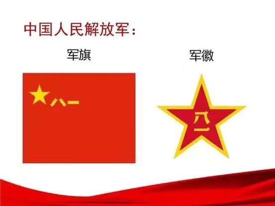 解放军军徽为五角红星嵌“八一”,象征革命与解放,红显喜庆,金边增辉,简洁精炼体现军队精神。