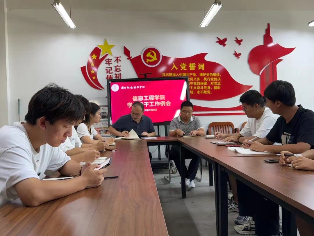 9月9日中午,信息工程学院在学院办公室6140举行了学生骨干工作例会。副院长楚书来,学管办主任张矿伟、团总支学生会主席董嘉宾、团总支学生副书记王佳硕及23级团总支学生会学生骨干8人,参加了本次会议,会议由楚书来主持。