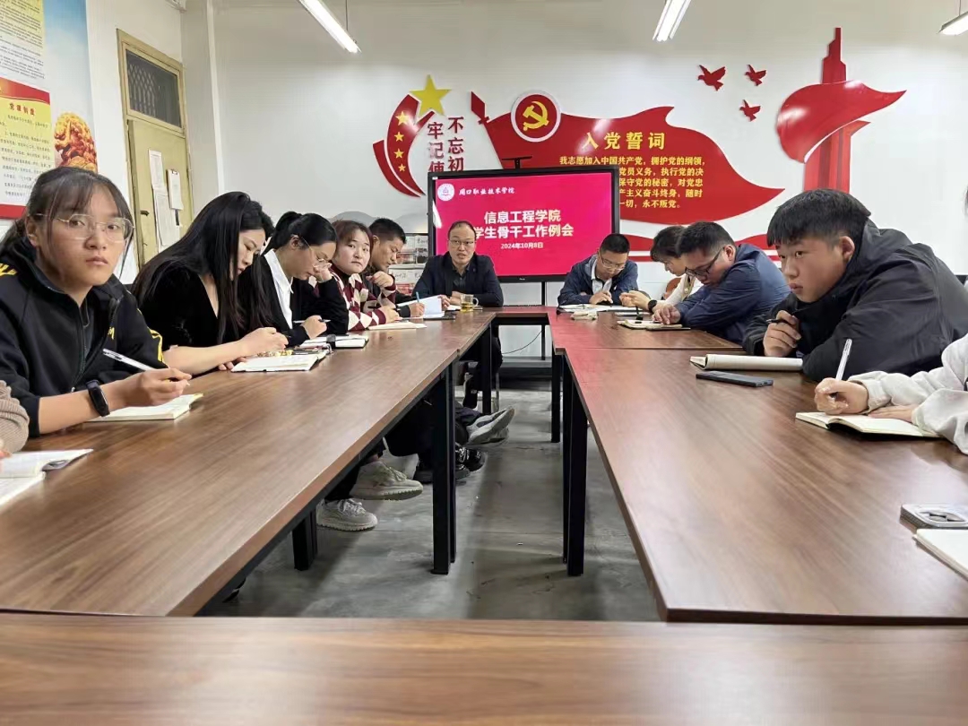 10月8日中午,在学院办公室6140,信息工程学院召开辅导员工作例会。副院长楚书来,学管办主任张矿伟,团总支学生会主席李金鹏,团总支学生副书记王佳硕及23级团总支学生会学生骨干8人,参加了本次会议,会议由楚书来主持。