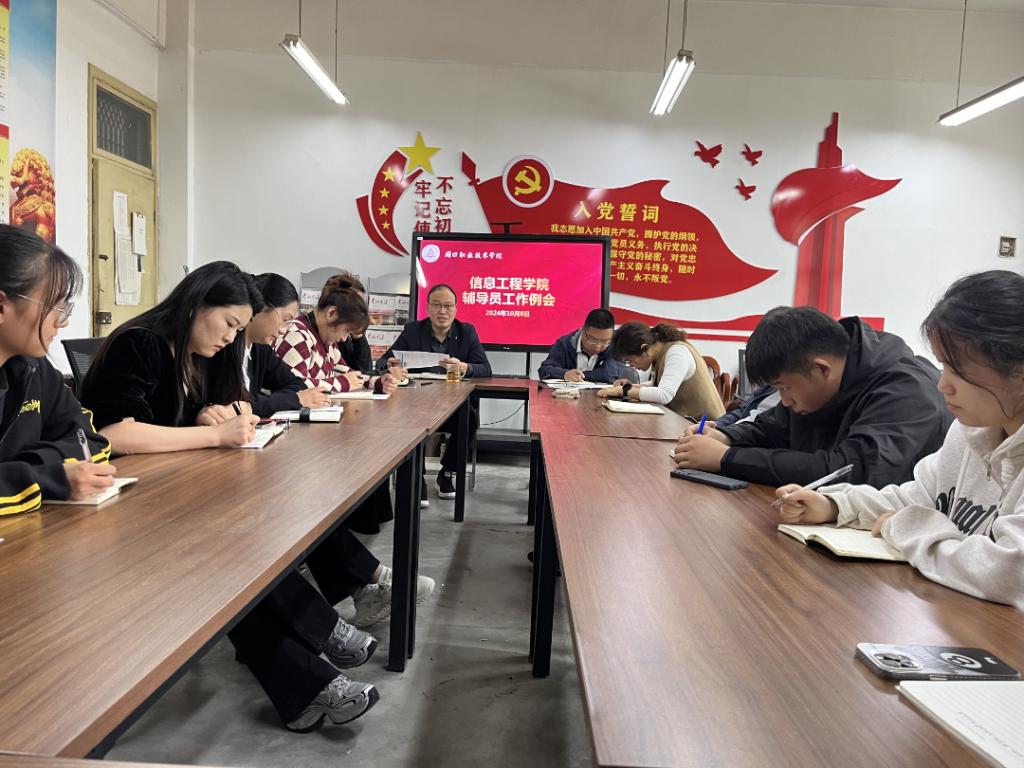 10月8日中午,在学院办公室6140,信息工程学院召开辅导员工作例会。副院长楚书来,学管办主任张矿伟及23、24级辅导员参加了本次会议,会议由楚书来主持。