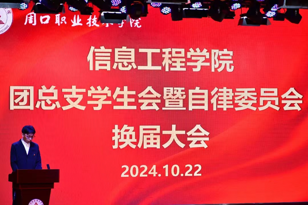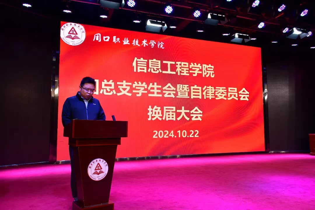 在金秋十月的美好时节,信息工程学院为了加强基础管理,营造良好的学院氛围,团总支学生会暨自律委员会迎来了换届。此次换届不仅有助于学院的学风建设,还能让学生干部们更好地服务于同学,服务于学院,同时也是提升学生干部服务能力、增强其工作能力的一个重要契机。10月22日中午,信息工程学院在学艺演播厅隆重举行了第二十一届团总支学生会换届大会,出席本次大会的有信息工程学院党支部书记宋良鹤、院长黄宇达、学管副院长楚书来、学管办主任张矿伟及各班辅导员、第二十一届团总支学生会全体成员、23级、24级班长团支书。