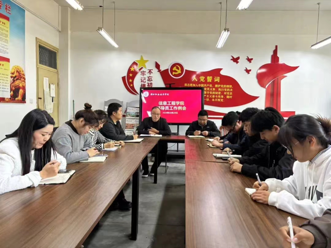 10月28日中午,在学院办公室6140,信息工程学院召开辅导员工作例会。副院长楚书来,学管办主任张矿伟及23、24级辅导员参加了本次会议,会议由楚书来主持。